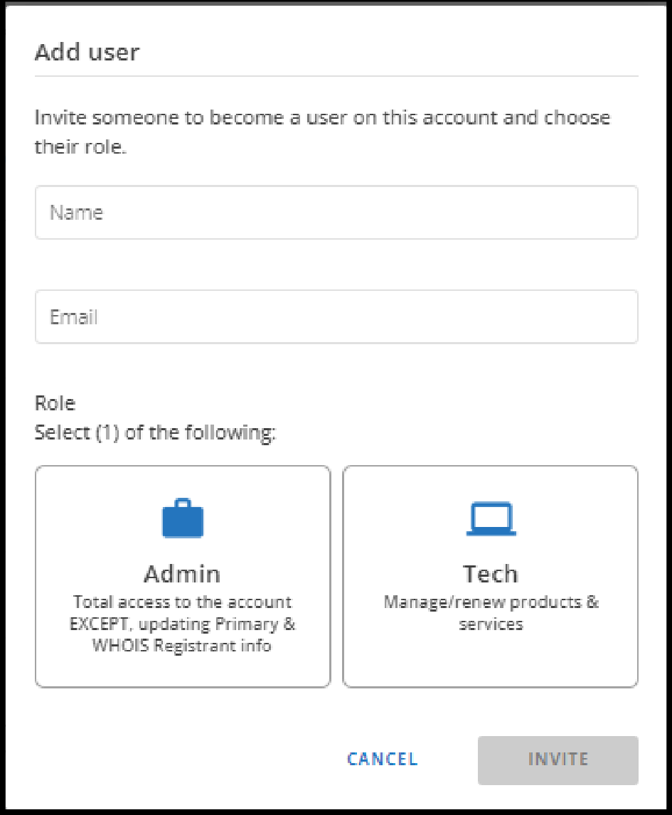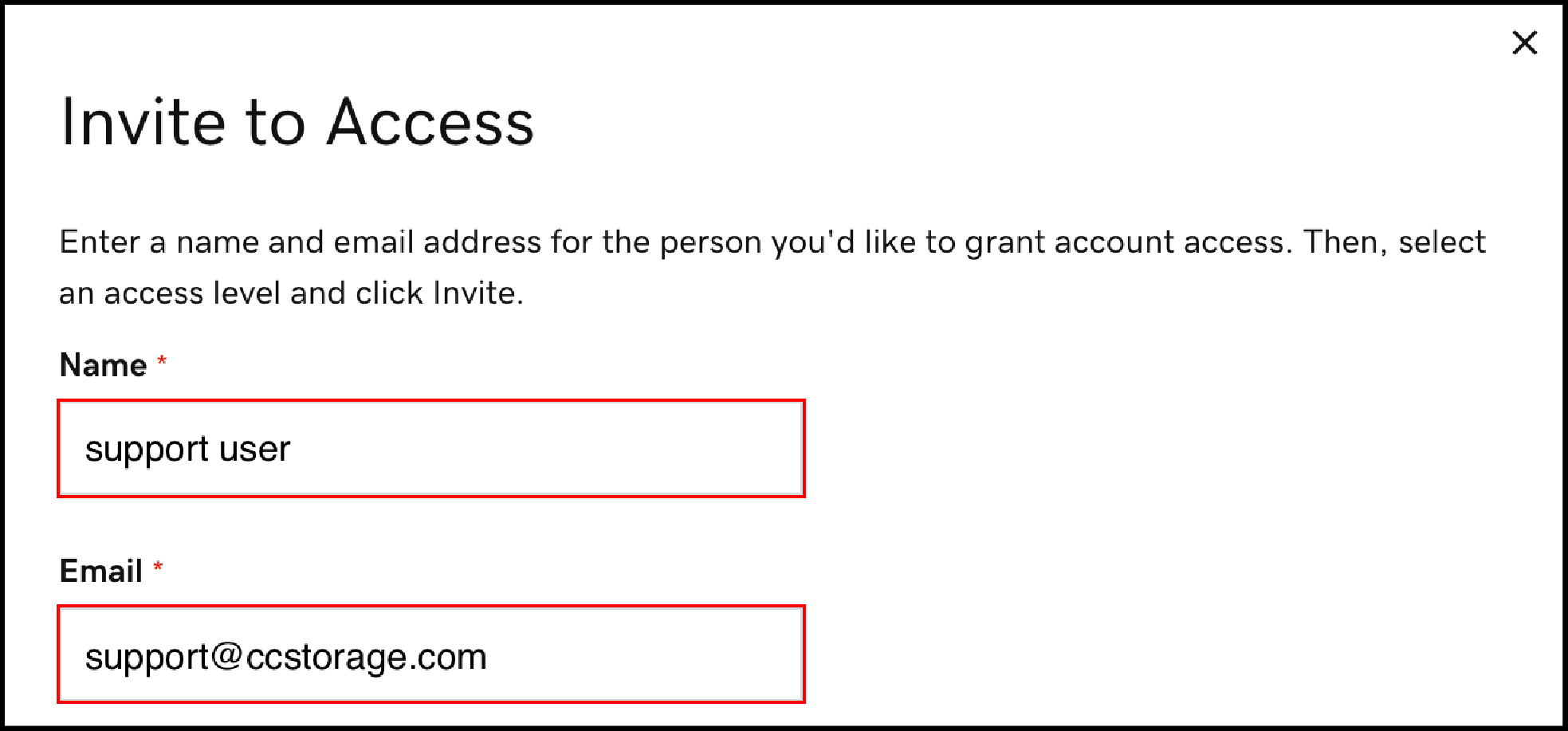 Enter the Name and Email address for the person you're inviting. Our name is supportuser and our email is support@ccstorage.com. Then click the admin role and then INVITE. See image below.
