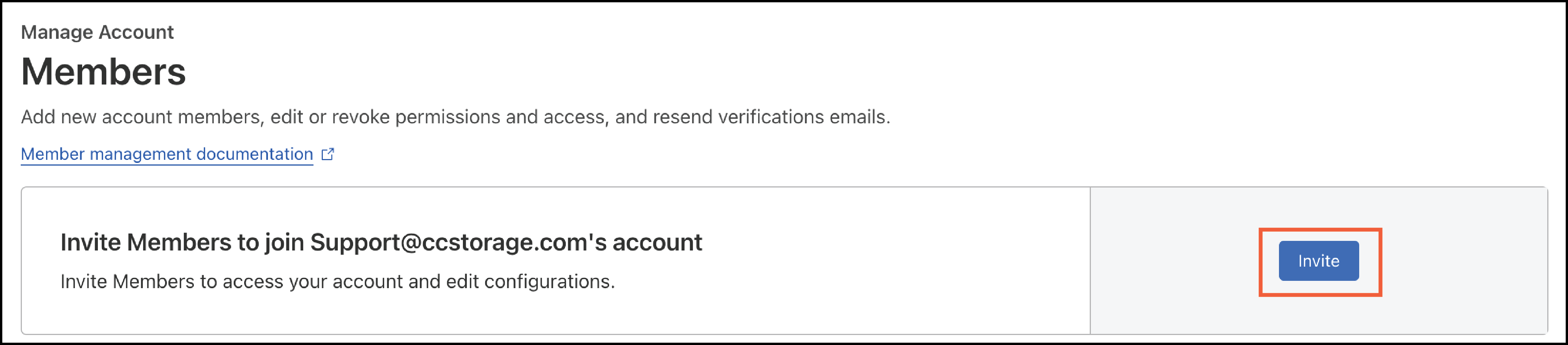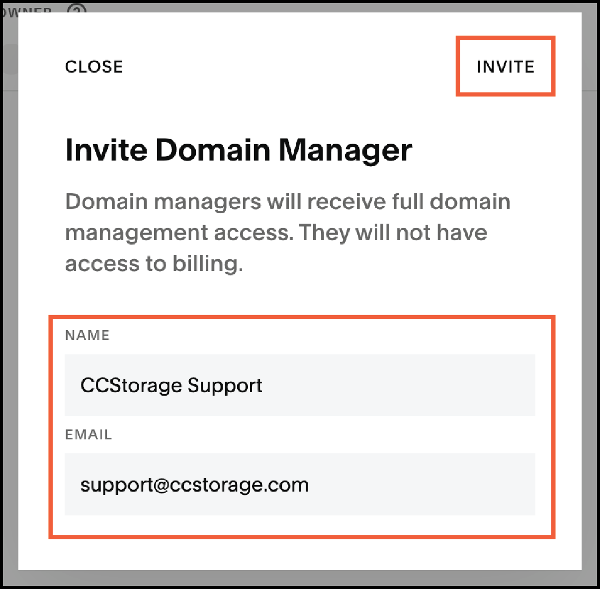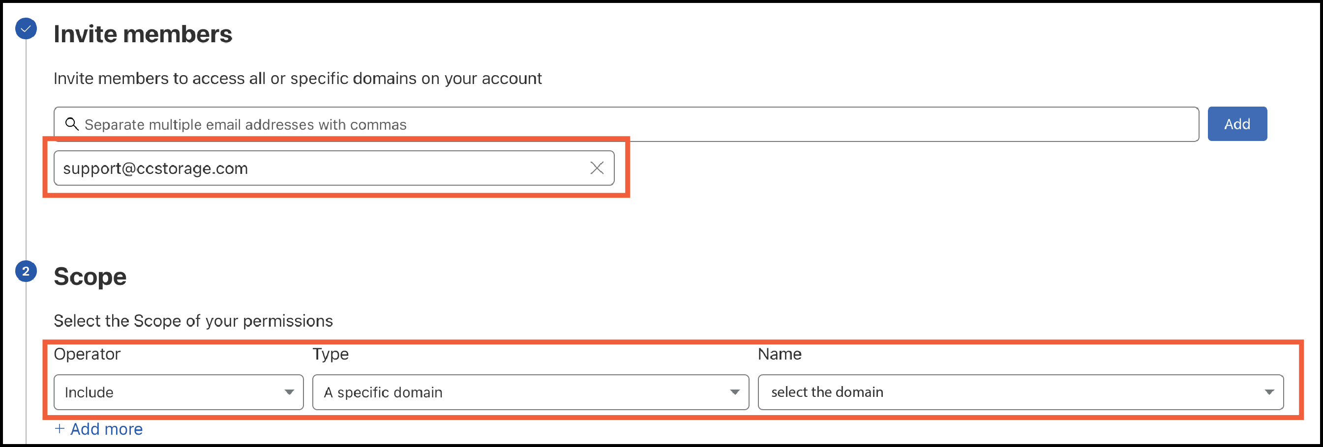 Then go to Invite members. Enter our email address which is support@ccstorage.com. Then with Scope, select include, then select a specific domain, and then select the domain you want to give us access. See image below.